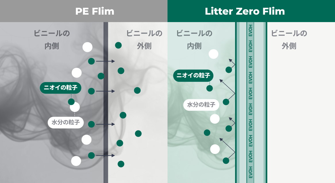 食品や医療用パッケージにも使われる、酸素や窒素などのガスを遮断する多層バリアフィルムを採用。リッターゼロは同じ高品質素材を使用し、ニオイをしっかり閉じ込めて逃しません。